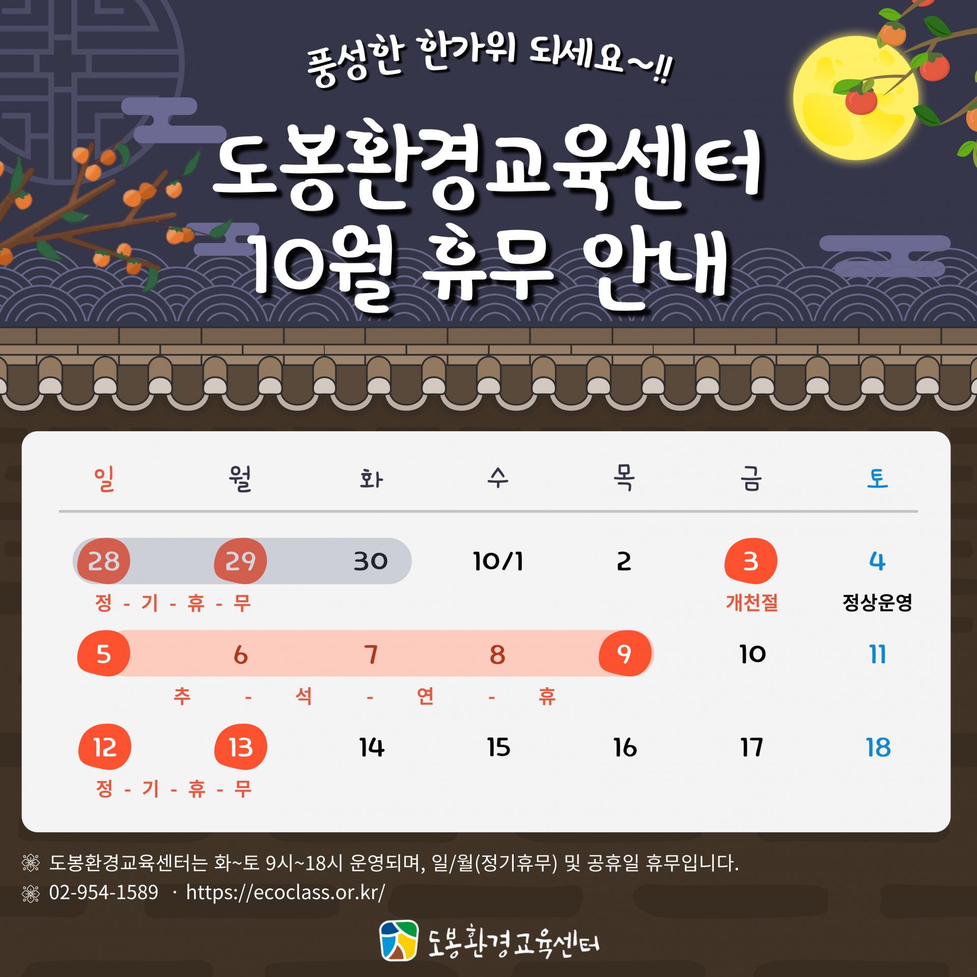 도봉환경교육센터는 매주 일, 월(정기휴무) 및 공휴일 휴무입니다.